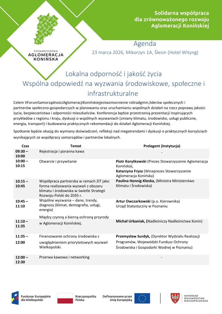 Agenda w wersji PDF do pobrania dostępna pod adresem : https://aglomeracjakoninska.org/wp-content/uploads/2026/03/Agenda_23_03_2026_Konferencja_Stowarzyszenie_Aglomeracja_Koninska_fin_18032026_-4-1FINALNA.pdf