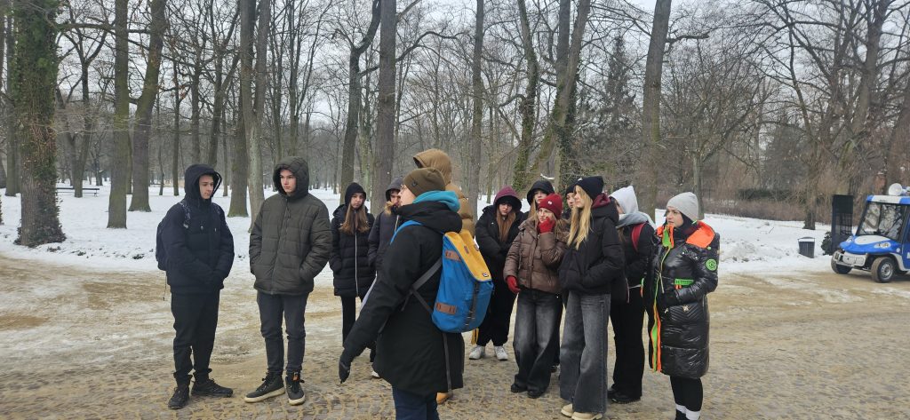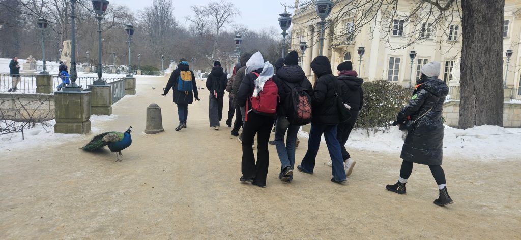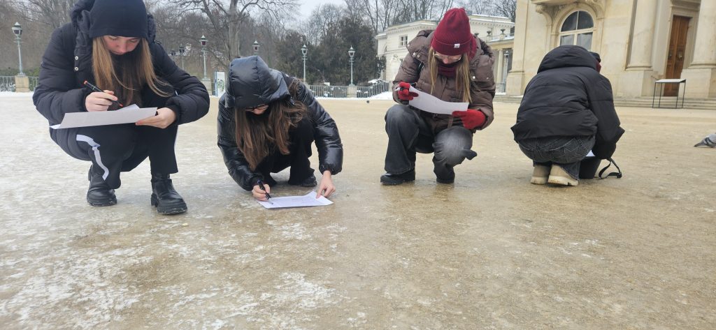 W programie nie zabrakło także poznawania miasta w praktyce. Jedna z grup rozpoczęła wizytę od spaceru po Łazienkach Królewskich połączonego z grą terenową, która pozwoliła zobaczyć stolicę z mniej „pocztówkowej”, a bardziej doświadczalnej perspektywy – przez współpracę w zespole, zadania w terenie i uważność na kontekst miejsca.