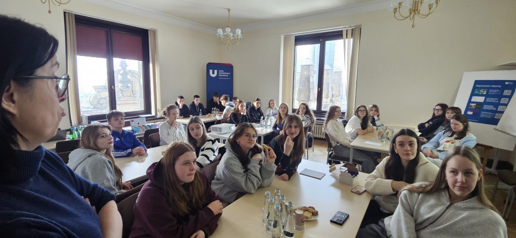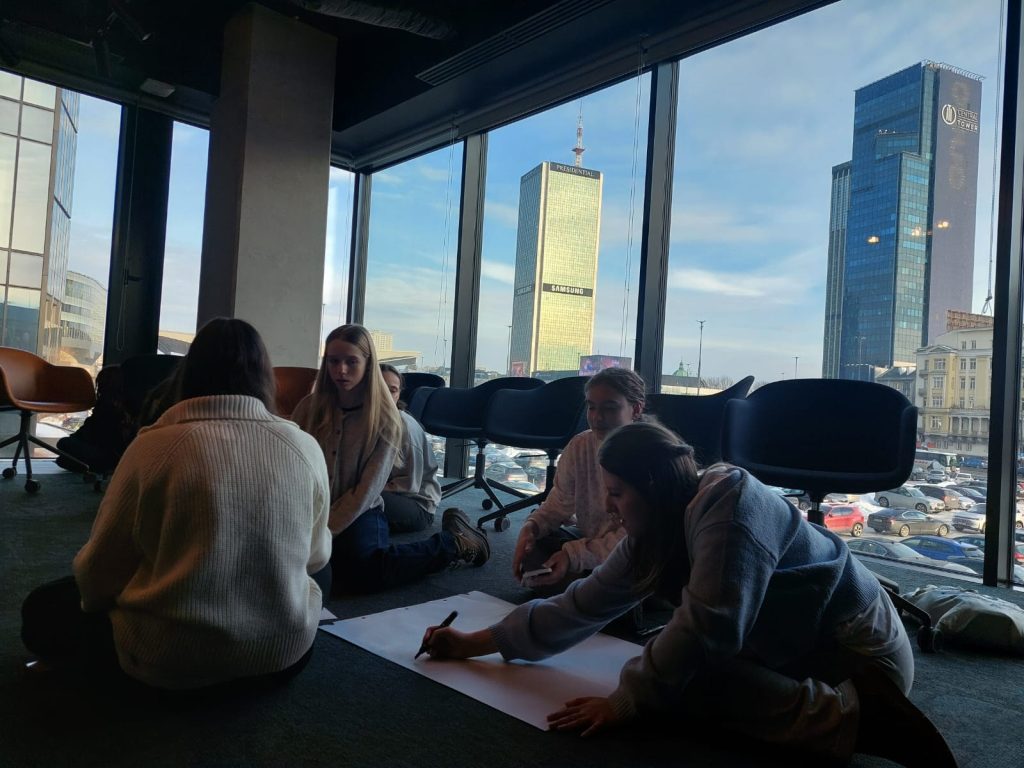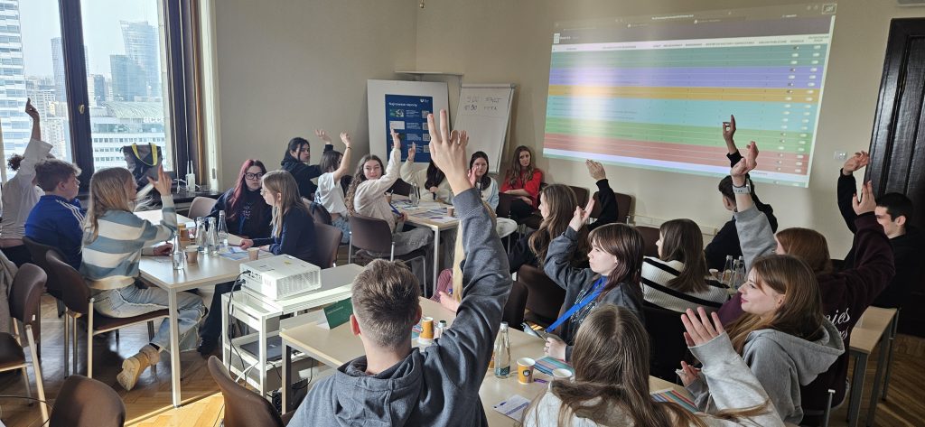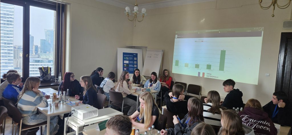 Drugiego dnia uczestnicy odwiedzili Pałac Kultury i Nauki oraz biuro Unii Metropolii Polskich, gdzie wzięli udział w symulacji „Miasto GRA”. Młodzi liderzy wcielali się w role miejskich radnych: planowali budżet, dyskutowali o priorytetach, negocjowali i wypracowywali kompromisy – dokładnie tak, jak wygląda samorząd w praktyce.